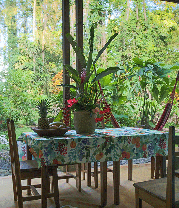 Este rancho esta en medio de nuestro jardín donde pasa el sendero de aproximadamente 100m entre la casa de huéspedes y la playa rodeado de un bosque de enormes árboles, donde es fácil observar gran variedad de diversidad de fauna como por ejemplo iguanas, monos, osos perezosos, muchas diferentes aves como el gavilán cangrejero, lapas verdes, tucanes para solo mencionar algunas.